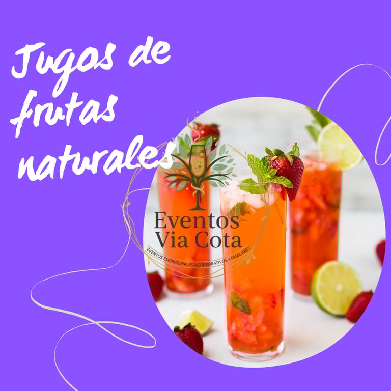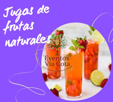 En Eventos Vía Cota, creemos que cada detalle contribuye a una experiencia excepcional. Por eso, hemos diseñado una oferta de Jugos de Frutas Naturales que no solo deleitará a tus invitados con sabores auténticos, sino que también añadirá un toque saludable y vibrante a cualquier celebración. Olvídate de las bebidas artificiales; te ofrecemos la frescura de la fruta recién preparada, servida con estilo.